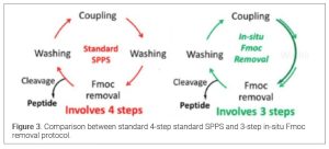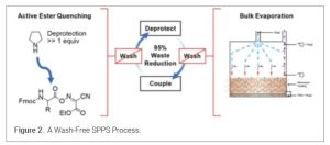 A 2023 breakthrough report on Nature Communication claimed that solvent-intensive washing steps could be eliminated by using volatile Fmoc deprotection bases and bulk evaporation with headspace gas flushing, reducing waste by up to 95% while maintaining peptide quality. (14) (Figure 2).