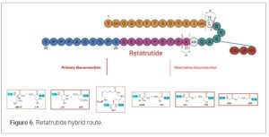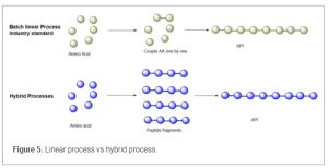 The rapid development and massive demand for GLP-1 receptor agonists (like semaglutide, tirzepatide, and others) have significantly accelerated advancements in peptide synthesis technologies. GLP-1 drugs require gram-scale to kilogram-scale production of complex peptides (20–40+ amino acids). SPPS linear synthetic protocols alone are no longer an industry standard for manufacturing peptide drug substance for pre-clinical and clinal studies. SPPS protocols, because of multiple sequential operations, often lead to additional risk related to potential manufacturing failure. If something fails during the linear sequence the entire batch may be compromised. Industry reports suggest as high as a 25% failure rate for linear approach peptide synthesis. (28) Hybrid synthesis combines SPPS and LPPS to overcome their individual limitations. In this approach, SPPS is used to synthesize peptide fragments, which are then coupled in solution via LPPS or ligation techniques. The synthesis of Fuzeon (29) (enfuvirtide), a 36-amino-acid peptide, on metric ton scale has demonstrated the viability of hybrid methods. For GLP-1 drugs, hybrid synthesis enables the production of long, complex sequences with high purity, addressing SPPS’s length constraints and LPPS’s solubility challenges. Recently, Eli Lilly’s manufacturing facility in Cork, Ireland, employed a hybrid SPPS-LPPS platform to produce Tirzepatide, achieving a production capacity of metric tons per year. (30) In this hybrid approach, SPPS is used to synthesize peptide fragments (6–14 amino acids), which are then coupled via LPPS. This reduces production times and enables parallel synthesis at multiple global supply nodes, enhancing supply chain resilience. (Figure 5)