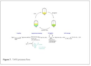 Tag-assisted peptide synthesis (TAPS) enhances SPPS or LPPS by incorporating chemical tags to improve solubility, purification, or coupling efficiency. These tags, often hydrophobic or hydrophilic groups, are temporarily attached to the peptide chain and removed after synthesis. (33) Early examples include the use of hydrophobic trialkoxyl-benzyl alcohols for synthesizing growth hormone-releasing peptides, combining LPPS with disulfide bond formation. The development began around 2005 for peptide synthesis, with formal reports in 2012 detailing a fluorene-derived anchor for efficient liquid phase peptide synthesis by using Fmoc/Boc protocol as with SPPS. (34) TAPS offers cost-effectiveness, scalability, and environmental benefits. It reduces reagent consumption by 5-8 times versus SPPS, using near-stoichiometric reagents and greener solvents like CPME or EtOAc. Solvent use can drop by 60%, with PMI (process mass intensity) often lower than SPPS. Homogeneous reactions improve coupling efficiency for sterically hindered amino acids, yielding >90% purity without chromatography. Peptide CDMOs have been actively involved in the development of tag assisted peptide synthesis (TAPS), and there were several talks in 2025 Tides USA related to this technology. Tag-assisted peptide synthesis has transformed LPPS into a viable, sustainable alternative to SPPS, enabling efficient production of therapeutic peptides. With technologies like AJIPHASE® leading commercial adoption, TAPS is poised to meet the growing demand for peptides in medicine, emphasizing green chemistry principles. Despite advantages, challenges include tag design for very long or hydrophobic peptides, where solubility issues persist. Cleavage conditions may cause side reactions, and some tags (e.g., PEG) complicate analysis due to polydispersity. Scalability for long peptides (>15 residues) remains limited. Future developments may integrate automation and flow chemistry for continuous TAPS to further reduce waste. Greener tags from renewable sources and hybrid SPPS-TAPS methods could address limitations. (Figure 7)
