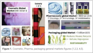 In 2021, the global packaging market reached 1 trillion US $, definitely a good health is observed for the sector + 8% growth over 2020/2021 and a large recovering after Covid crisis (now around 4% growth). Plastic remains the first material used for packaging, but paper growing in all sectors and definitely, in all universes, the surging wave of sustainability is becoming a tangible reality; it’s no longer an option. Looking to 2040 the 3R challenge (Reduce, Reuse, Recycle) has been expanded to 5R integrating two more ideas: Refuse and Repurpose (Figure 1) (4).
