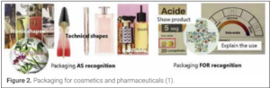 Cosmetic packaging can be seen as smart for design and function (used on the move, adapted for intended uses), smart for eco-design with sustainability fully integrated with a pack that presents no impact on waste management, and a pack ‘safe-secure-inert’ tracked on its entire life, with ideas of interactive and informative packaging that provide both education and information on products. Cosmetic packaging presents a huge effect as brand recognition and sometimes technical shapes (especially for perfumes bottles) with always more pack are refillables. Similar purposes are found on Pharma world despite the high levels of regulation and the differences between primary pack in direct contact with the drug form and part of DMF and secondary pack that contain primary pack and give requested legal information on medicine. Secondary packs offer a real therapeutic education effect with the use of photos on drug pack showing the product in real size (Figure 2).