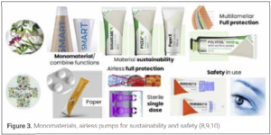 Combining function is one major statement on a large part of packaging which is also fully in relation with always more sustainability, as monomaterial, lighter and easily recyclable, as pouch combined with bottle (easier restitution with similar filling than bottles) or numerous tubes designed with less material (different shapes) or renewable resources (sugarcane, picea, papers). Cosmetics integrate largely this variety of tubes that can offer similar protection than multilamellar materials such as polyfoil® and new MMB polyfoil® (Figure 3).