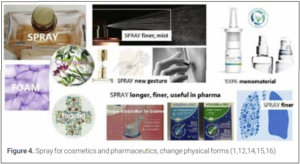 Packaging can modify the physical form of product, as example the spray that dissociates the particles and widens the surface, offering new sensations to users; spray allows creating foam when it adds bubbles to product, with pump and/or gas. Cosmetic world largely adopts the spray packaging with a large diversity: spray larger, finest (mist) or longer are used for perfumes or make-up. In Pharmaworld, the spray is proposed for topical uses with design adaptation to patients (nasal wash for babies) and there is a large development of spray for nasal systemic treatments with a needed accuracy in dosage. Latest development proposed to create finest mist uses for topical nasal treatment and more efficiency for next generation of inhaled drugs. Sustainability is not forgotten in the spray world, with the use of sustainable materials, monomaterial, cardboard and cartridges that greatly limit the carbon footprint (Figure 4) (11,12,13).