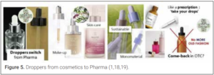 For liquid or semi liquids, cosmetic world have largely adopted droppers old fashion and no more often used in pharma; they appear as ‘must-have’ for cosmetic make-up with lots of adaptations as sustainable monomaterial keeping the idea of taking your drops as a prescription! May be soon there will be a coming back for droppers in the OCP Pharmaworld (Figure 5).