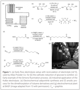 Pioneering work in the field of synthetic electrochemistry dates from the early and mid- 19th century, with the work of Faraday and the development of the classical Kolbe decarboxylative coupling. Not long after, several processes were implemented in industry. Notably, the use of flow electrolysis cells as the essential tool to scale up electro-organic transformations was already introduced nearly 100 years ago. An illustrative example is the flow process (Figure 1a) developed by the Atlas Powder Company in the 1930s for the manufacturing of sorbitol via cathodic reduction of glucose (Figure 1b)(9). The process featured a Zn cathode and a Pb-based anode, with an electrolyte consisting of an aqueous Na2SO4 solution. Several important electrochemical transformations involving organic compounds were developed from the 1950s to the 1970s. An example is the Simons fluorination process, the most common methodology to generate perfluorinated compounds. It uses HF as the fluorine source, which is attached to organic molecules under electrolytic conditions involving Ni electrodes. An early example disclosed by Simons described the multi-kilogram scale transformation of pyridine into perfluoropentane (Figure 1c), which generates NF3 as byproduct (10).