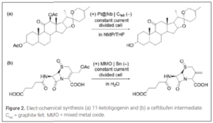 With the turn of the century, electrochemical processes involving more complex organic molecules were disclosed. Key to these advances were the development of important modern cell components from the 1960s to the 1980s, including mixed-metal oxide (MMO) electrodes and proton exchange membranes. For example, the Electrochemical Company described reductive deacetoxylation processes using flow electrolysis cells for the preparation of 11-ketotigogenin (Figure 2a)(14) and a key intermediate in the manufacturing of ceftibufen (Figure 2b)(15). Notably, the second example was carried out on a 2.8 kg scale using a repurposed ICI FM21-SP electrolyzer, originally designed for chlor-alkali production. The electrolyzer incorporated an MMO oxygen-evolving anode and a Nafion 350 cation-exchange membrane. Both reductive transformations showcased that conventional metal-based reductants can be successfully substituted by greener electrolysis methods.