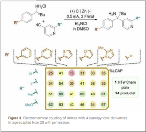 In medicinal chemistry, electrochemical methods are gaining traction as a tool for late-stage functionalization. Electrochemistry can provide excellent results for this purpose, particularly on small scale, as potentiostatic electrolysis can provide unique selectivity by applying the electrode potential matching the redox potential of the functional group of interest (19). Additionally, the development of several high throughout electrochemical experimentation platforms is enabling chemists to optimize reaction parameters and synthesize libraries of compounds efficiently (20). An example, disclosed by process chemists from Merck & Co., Inc., described the parallel synthesis of a library of 24 amines via the reductive coupling of imines with 4-cyanopyridine derivatives (Figure 3).