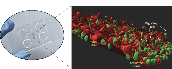 Caption: Inside the microfluidic chip, a 3D model replicates the microenvironment in which the tumor thrives, including the endothelial cells and the T cells derived from the patient.