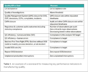 Performance in ensuring quality must also be measured at the organization level through a balanced scorecard. The scorecard should include factors such as the lot acceptance rate, the number of invalid out-of-specification (OOS) results, and the proper completion of all investigations (Table 1). Tracking performance against these key performance indicators (KPIs) fosters a culture of continuous improvement.
