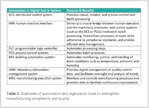 Moving forward, forward-looking CDMOs, like other advanced pharmaceutical manufacturing organizations, will want to expand their use of automation and digitization to include even more advanced technologies and tools, such as model-based process development and digital twins, as well as GMP applications of artificial intelligence and machine learning. The report from the second Listen and Learn Focus Group meeting of the EMA’ Quality Innovation Group (QIG) provides examples of the application of such tools (8).