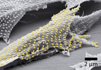 An array of gold nanodots was “tattooed” onto a living fibroblast cell.
